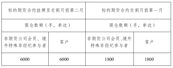 期权和标的期货分开限仓。非期货公司会员、境外特殊非经纪参与者和客户持有的某月份期权合约所有看涨期权的买持仓量和看跌期权的卖持仓量之和、看跌期权的买持仓量和看涨期权的卖持仓量之和,分别不得超过下表所示的持仓限额。具有实际控制关系的账户按照同一账户管理。